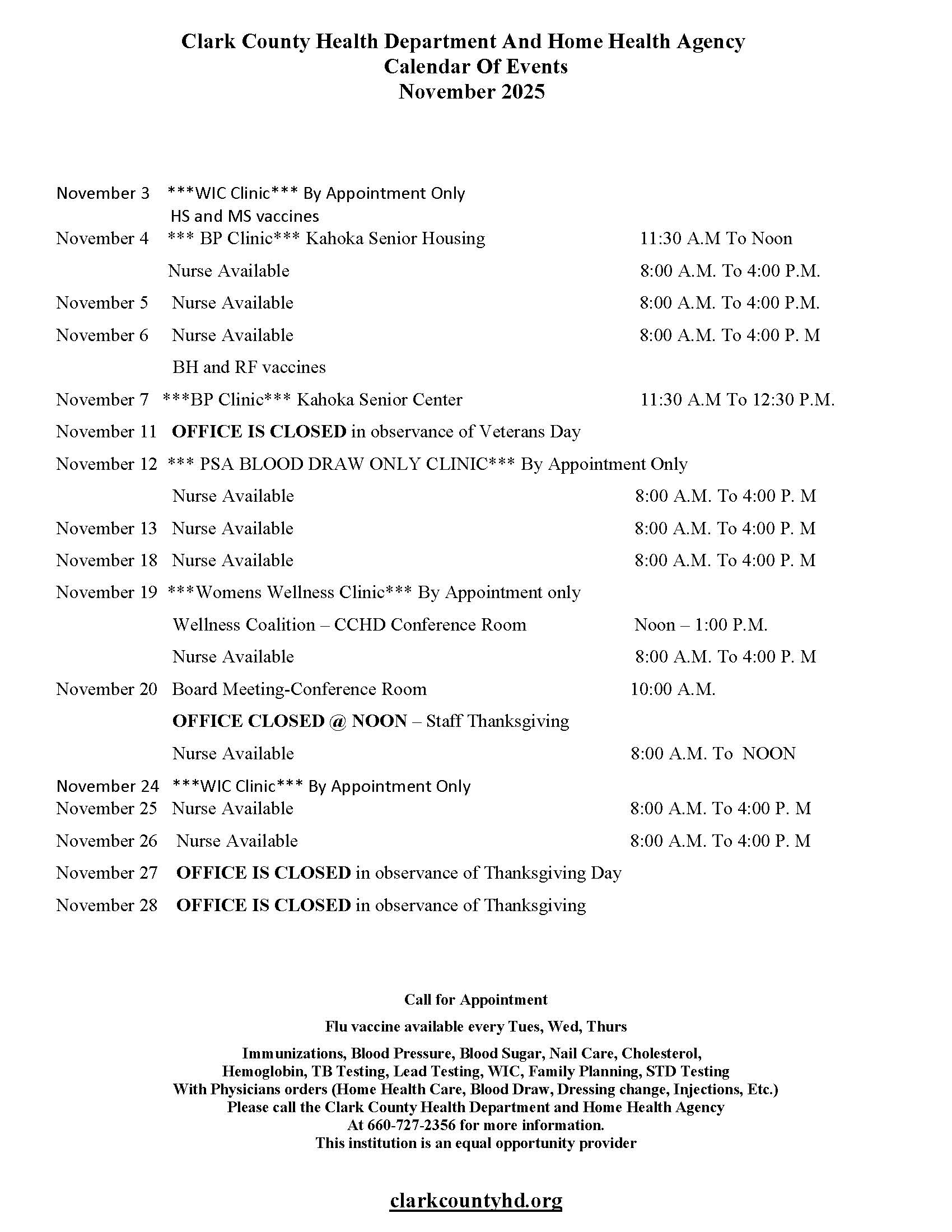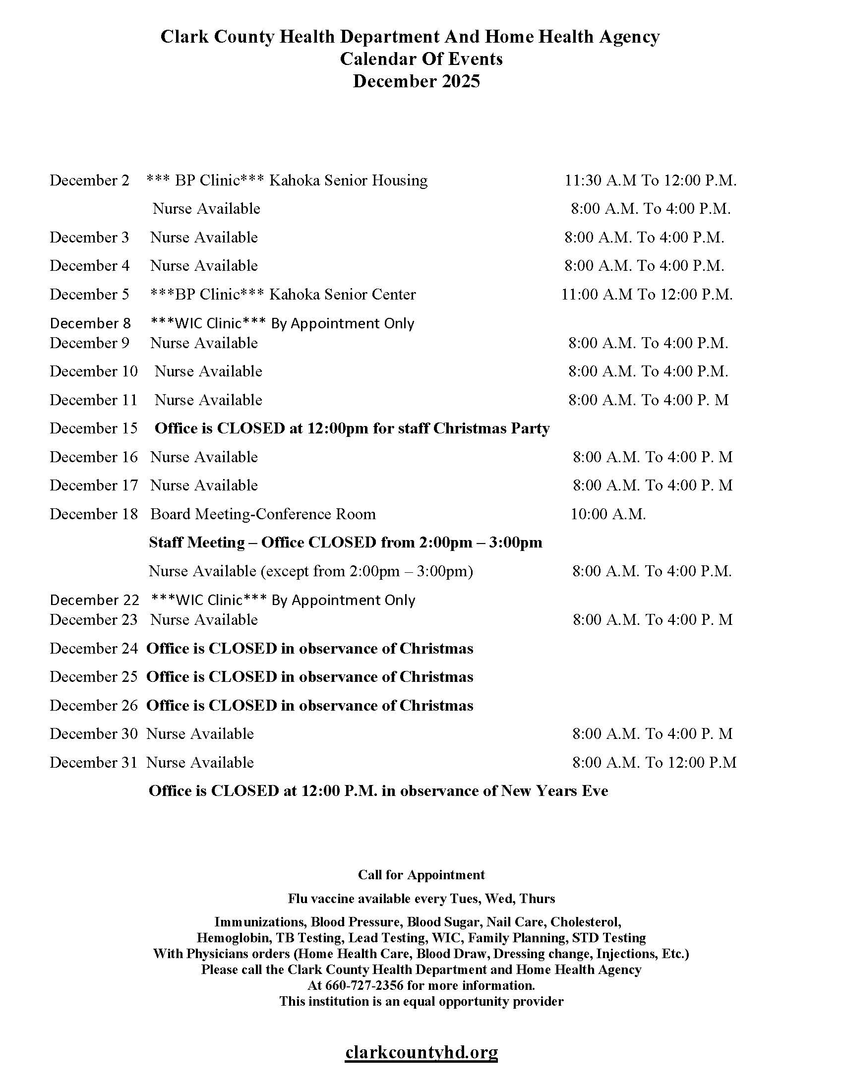 The Clark County Health Department is staffed with qualified nurses, physical therapists, occupational therapists, speech therapists, home health aides, and clerical personnel. These services are available to all age groups.
