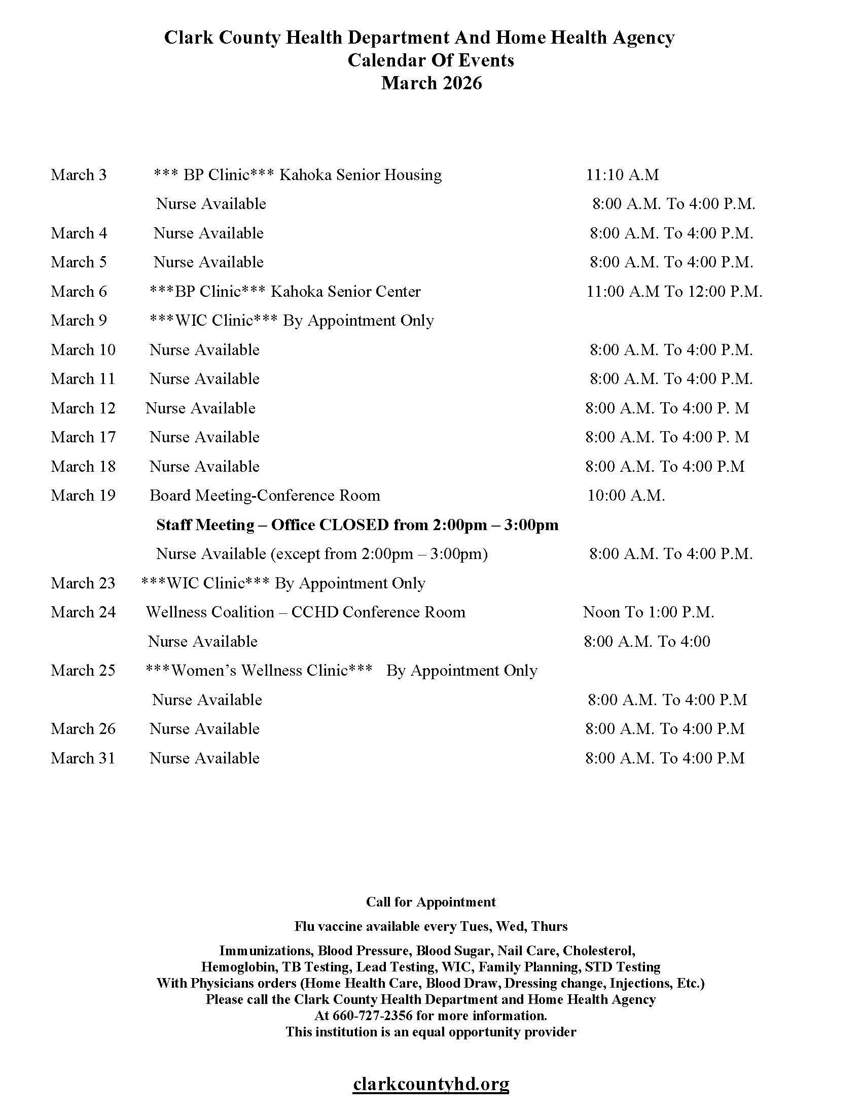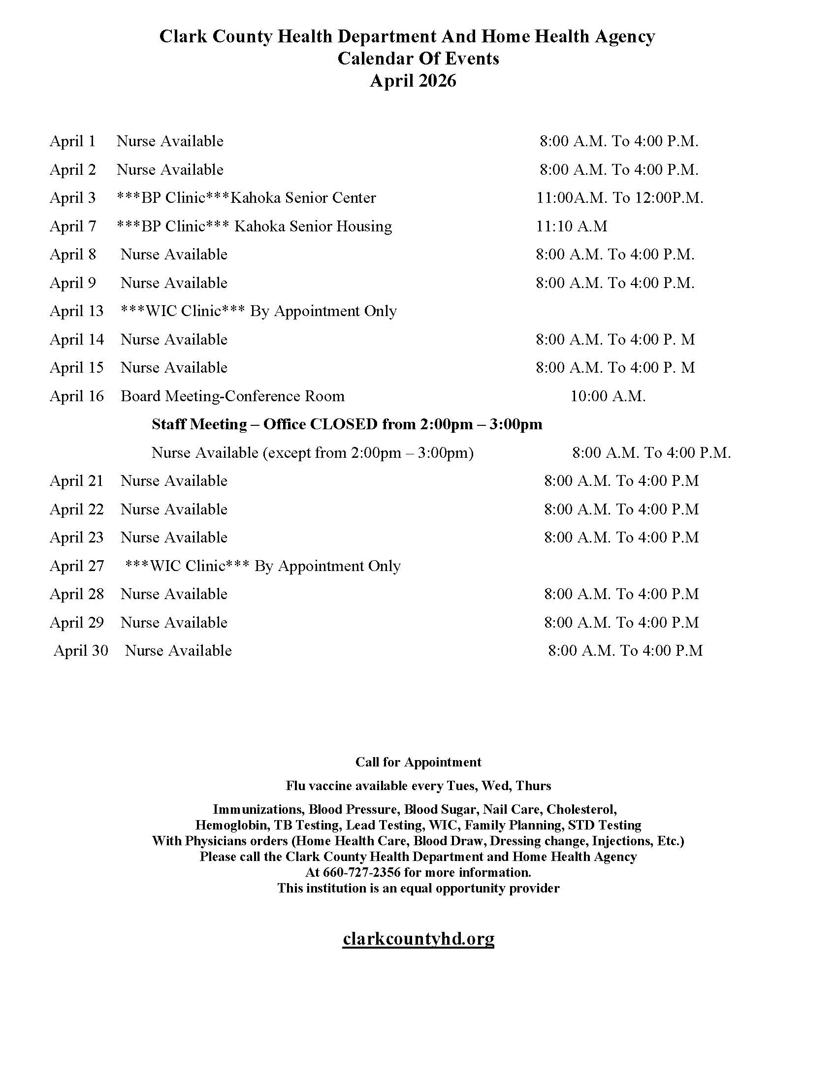The Clark County Health Department is staffed with qualified nurses, physical therapists, occupational therapists, speech therapists, home health aides, and clerical personnel. These services are available to all age groups.